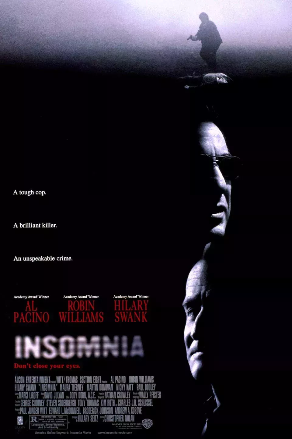 El segundo largometraje de Christopher Nolan, Insomnia, se centra en un asesinato cometido en un pequeño pueblo de Alaska en un momento en que se basa en la luz perpetua del día. Al Pacino y Martin Donovan interpretan a dos detectives de la policía de Los Ángeles -Dormer y Eckhart- enviados para ayudar a investigar el caso. Dormer está siendo investigado por asuntos internos, y Eckhart ha aceptado testificar en su contra. Durante una brumosa persecución a pie, Dormer dispara a Eckhart, dejando que incluso él se pregunte si fue un accidente.