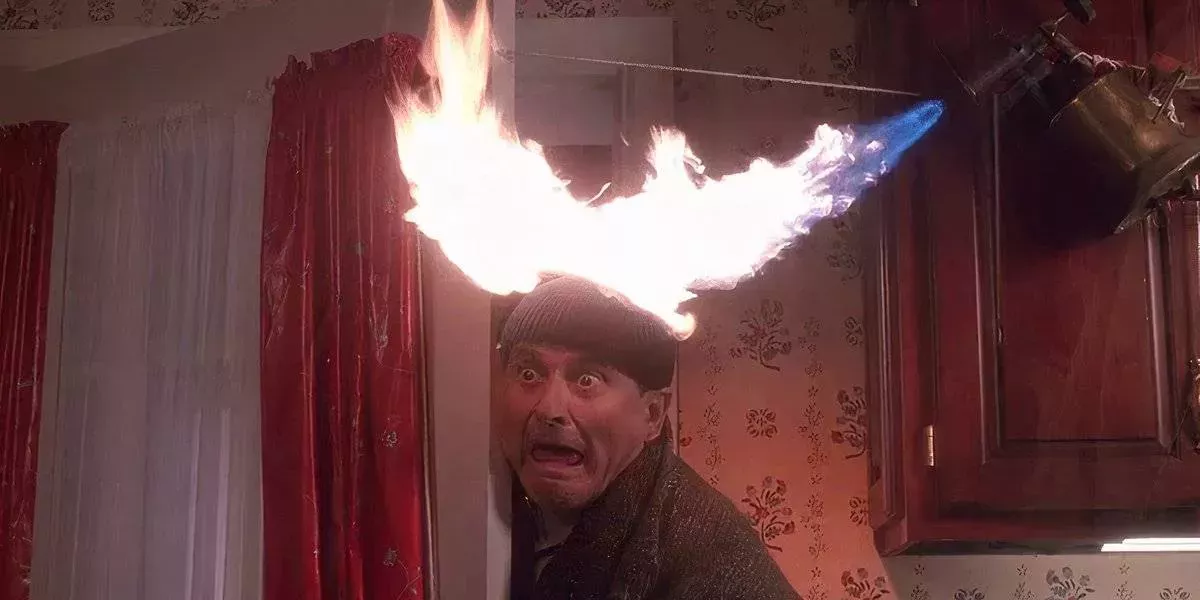 Desde el punto de vista estético, la trampa más memorable de la primera Home Alone es cuando el pobre Harry consigue por fin entrar en la casa de los McCallister, sólo para que le prendan fuego a toda la parte superior de la cabeza gracias a un soplete perfectamente colocado.