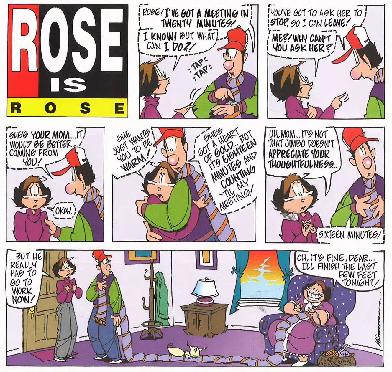 Rose hacía que ser un ama de casa tradicional pareciera fácil, con su glamour y alegría asombrando a los lectores. Su marido, Jimbo, hacía todo lo posible para que su estilo de vida fuera aún más fácil. Con frecuencia colocaba notas de amor por toda la casa para que Rose las encontrara. A menudo tienen citas y hablan de sus emociones y sentimientos en profundidad, algo que no suelen mostrar otros cómics. A pesar de estos rasgos únicos, Rose is Rose es sin duda uno de los cómics más infravalorados de la historia.