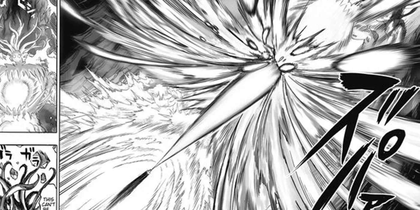 Naturalmente, esto deja muy pocas vías de escape a la pobre víctima. Garou consigue eludir el ataque intentando escapar a través de un portal hiperespacial, pero Saitama le propina un puñetazo serio de todos modos. A fin de cuentas, el Puñetazo Omnidireccional sólo se ha utilizado una vez en toda la historia. No tiene sentido contra nadie que no sea Garou.