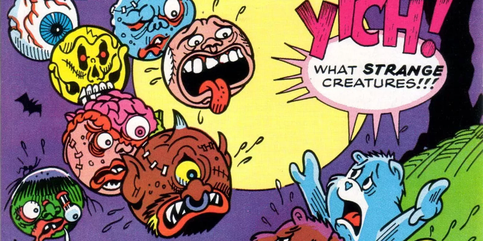Protagonistas de su propia serie de 1986, los Madballs se enfrentaron al científico loco Dr. Frankenbeans, obsesionado con capturarlos. Pero quizá lo más extraño de todo fue el cruce de los Madballs con los Care Bears, una línea de juguetes en el polo opuesto del espectro de la ternura con su propia serie de cómics publicada en Star Comics. Los Osos Cuidadores se las tuvieron que ver con los pegajosos y abultados Madballs. Todo en nombre de una diversión viscosa y divertida, pero para los fans de los Ositos Cariñosos debió de ser un gran shock ver a sus osos favoritos acosados por las espeluznantes Bolas Locas. Más sorprendente que el hecho de que los Madballs tuvieran su propia serie de cómics es que los juguetes supergroseros recibieran una segunda serie.