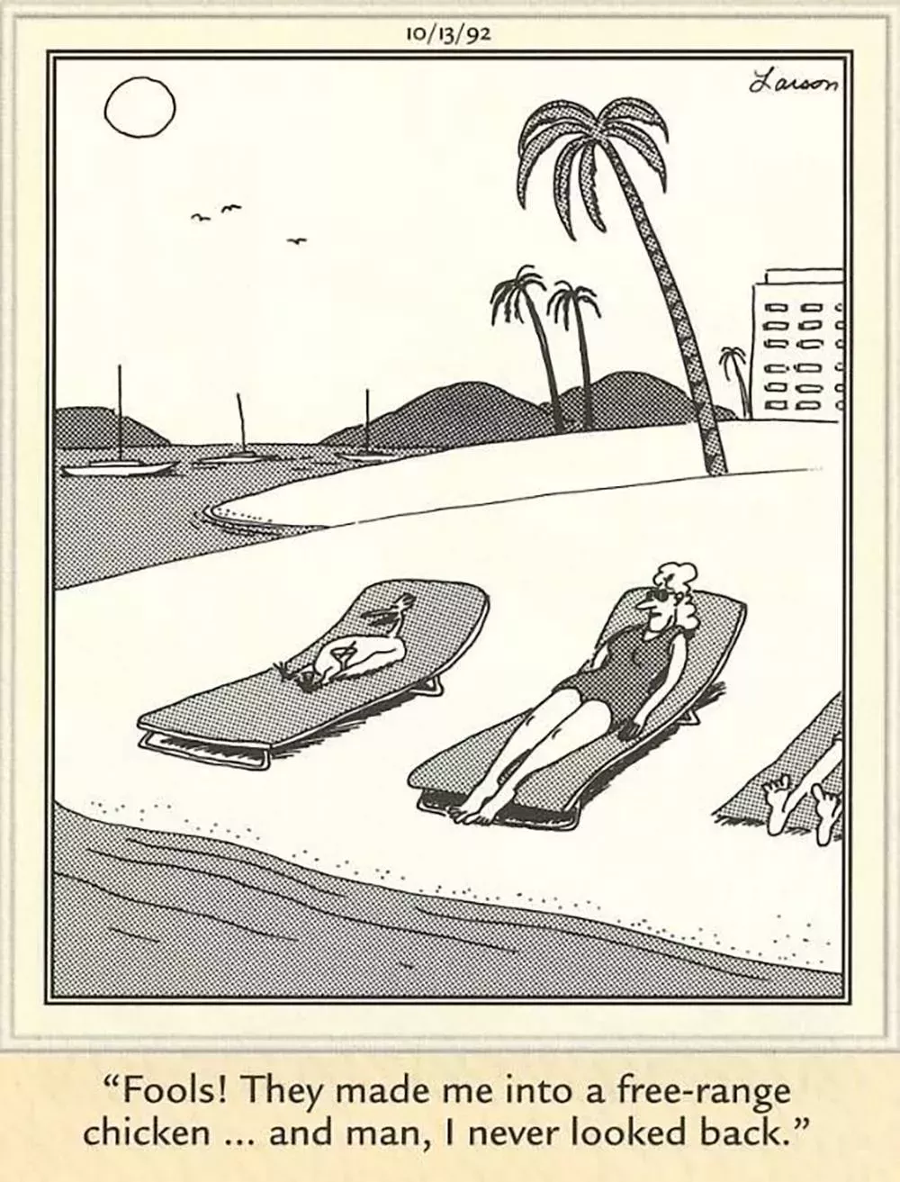 Durante las décadas de 1980 y 1990, The Far Side fue una de las tiras cómicas más populares. Conocido por su humor absurdo y sus comentarios sobre la sociedad y la cultura, The Far Side proporcionó muchas risas a través de su sindicación en periódicos, volúmenes recopilatorios y productos relacionados. The Far Side utilizaba con frecuencia animales en sus cómics de un solo panel; un tipo de animal que empleaba especialmente eran las gallinas.