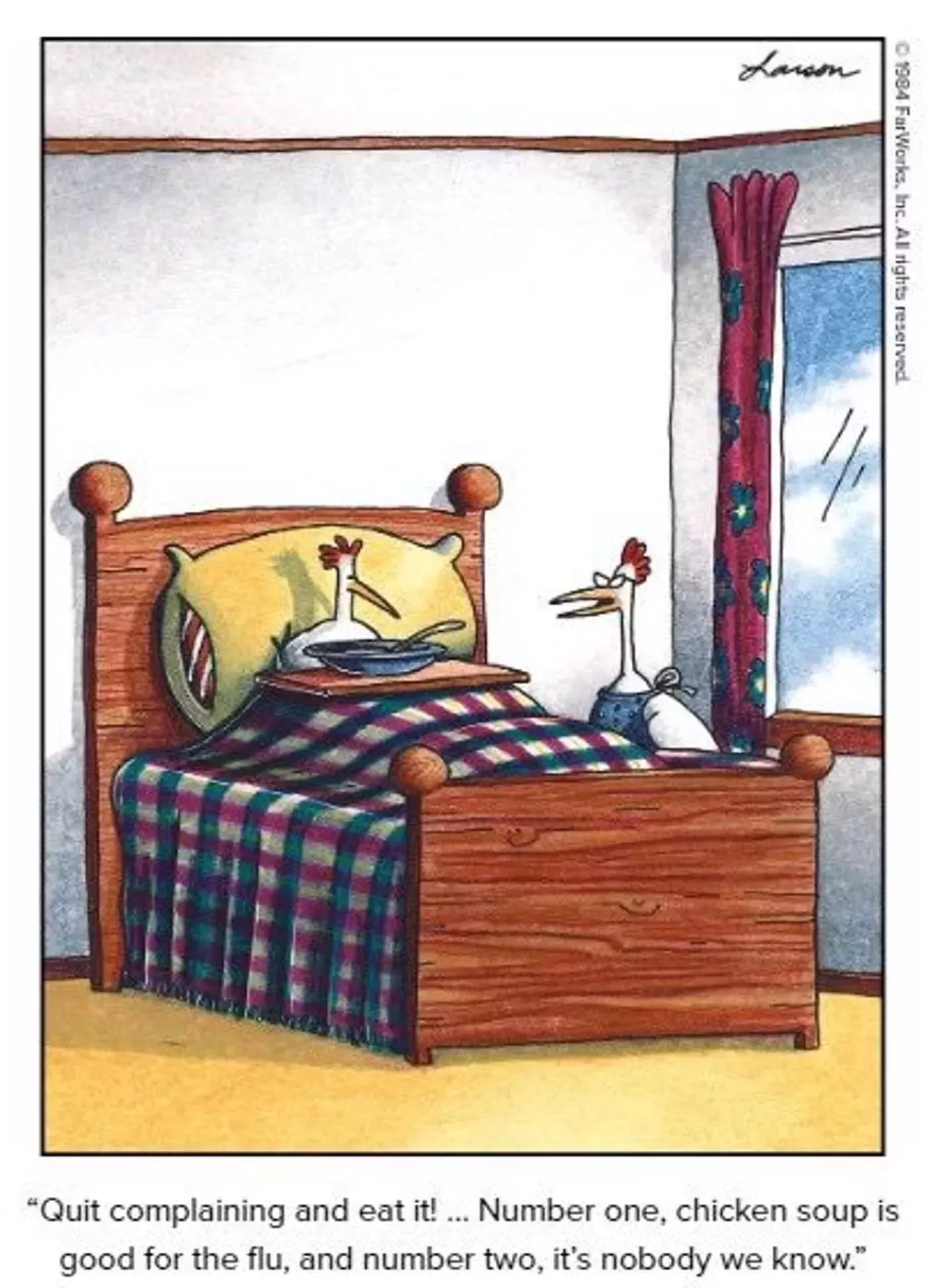 Los cómics de The Far Side solían tener un sentido del humor bastante negro. En The Far Side ocurren cosas horribles con regularidad. En esta divertidísima viñeta de Far Side, a un pollo enfermo le sirven sopa de pollo para remediar su enfermedad. El pollo enfermo podría horrorizarse ante el aparente canibalismo, pero los lectores no pueden evitar reírse de las justificaciones de los pollos para comerse a los de su propia especie.