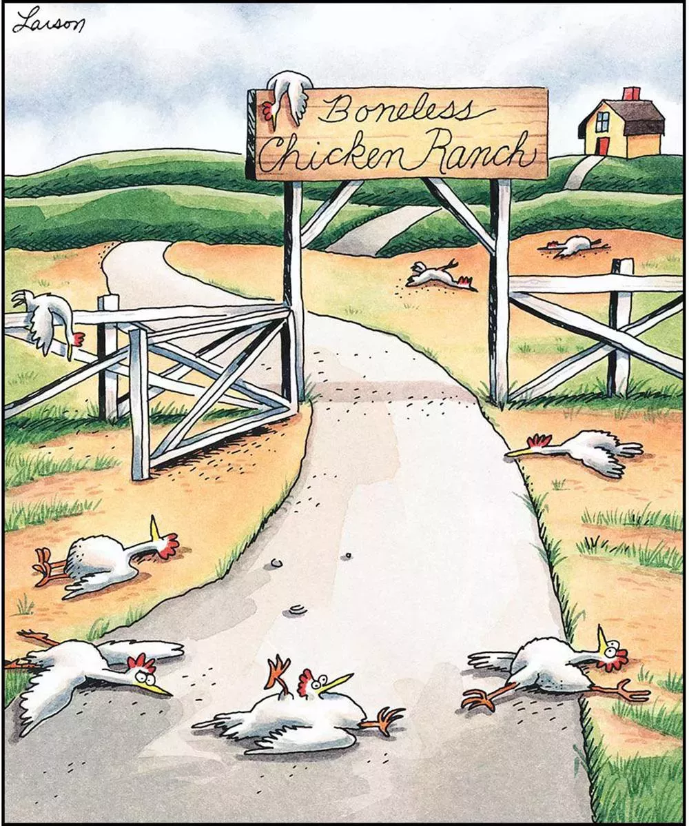 The Far Side empleaba a menudo juegos de palabras en su humor característico, y una técnica que utilizaba la tira cómica era hacer expresiones literales, con resultados absurdos. The Far Side también solía utilizar animales de granja, como pollos, en sus historietas. Aquí, esas dos técnicas se han combinado para imaginar de dónde podrían proceder realmente los trozos de pollo deshuesados.