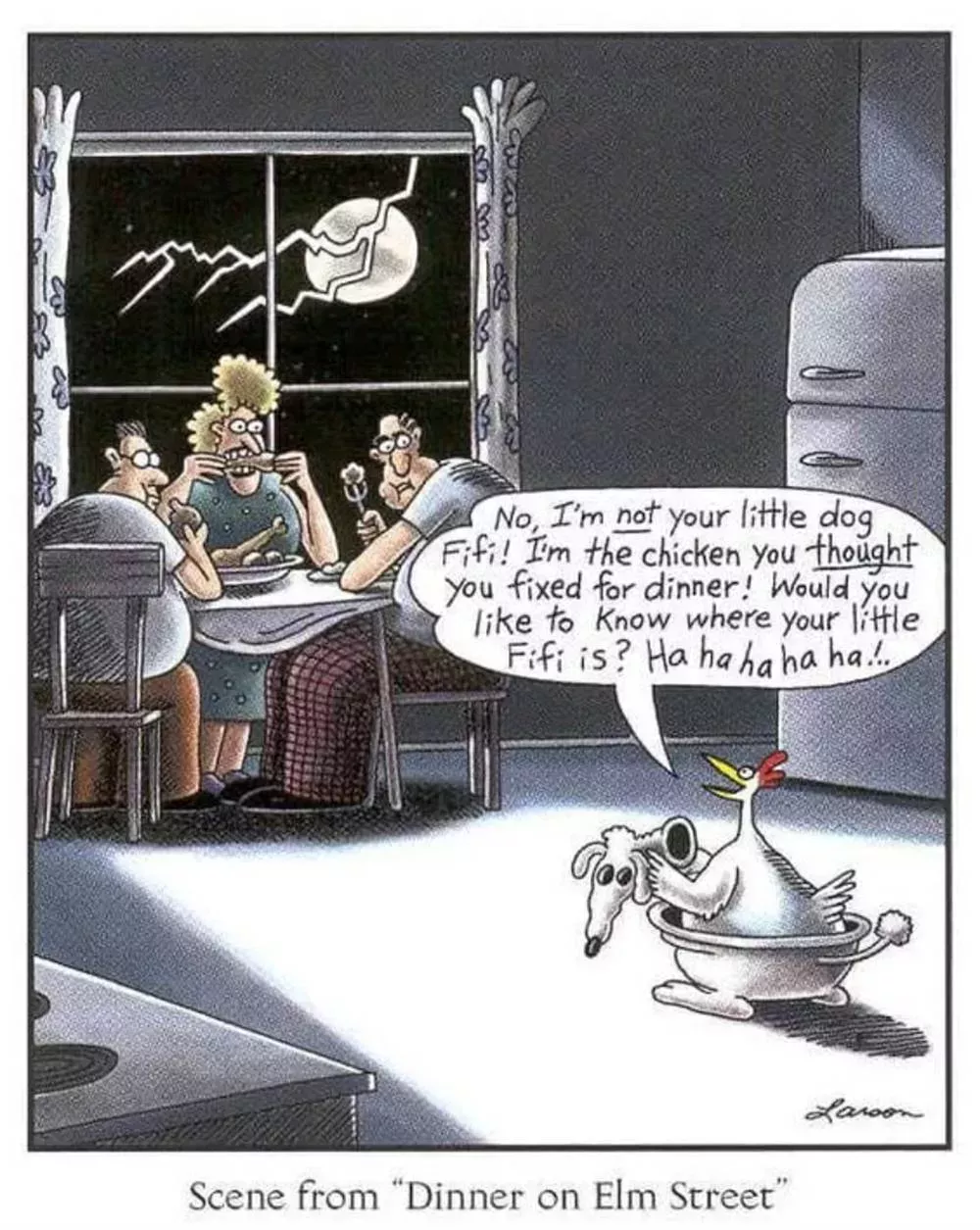 Los pollos son una fuente de carne increíblemente común en muchas culturas de todo el mundo. Aunque tanto los pollos como los perros son animales, la mayoría de las culturas occidentales se horrorizan ante la idea de comerse un perro. En este cómic de The Far Side, esa hipocresía se pone de manifiesto cuando los comensales humanos se dan cuenta de la horrible realidad de lo que acaban de consumir.