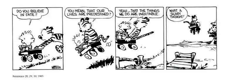 Una de las actividades favoritas de Calvin y Hobbes es bajar volando por las colinas cercanas en su vagoneta. Normalmente, su peligroso comportamiento les lleva a situaciones precarias. En este caso, el dúo se encuentra corriendo a una velocidad vertiginosa hacia un lago. Con una posible tumba acuática a la vista, no es de extrañar que la mente de Calvin se incline hacia una línea de pensamiento más filosófica. En concreto, empieza a preguntarse si existe el destino.