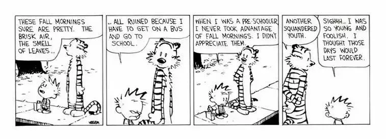 Un lugar habitual donde Calvin pasa grandes momentos exponiendo sus pensamientos y opiniones es en la parada del autobús. No es ninguna sorpresa, ya que es inflexible sobre su aversión a la escuela. Lo sorprendente es que Calvin se dio cuenta de que perdía el tiempo al no disfrutar plenamente de la belleza de su entorno. Reconoce que, aunque pudo pasar tiempo al aire libre durante sus años de preescolar, nunca disfrutó adecuadamente de su entorno.
