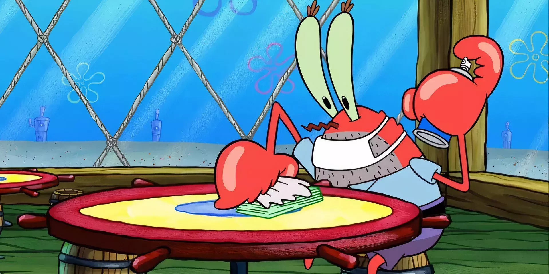 El Sr. Cangrejo es conocido en Bob Esponja por ser un gran tacaño. Como jefe del Crustáceo Crujiente, el Sr. Cangrejo toma la decisión ejecutiva de despedir a Bob Esponja para poder ahorrarse literalmente cinco céntimos al año.