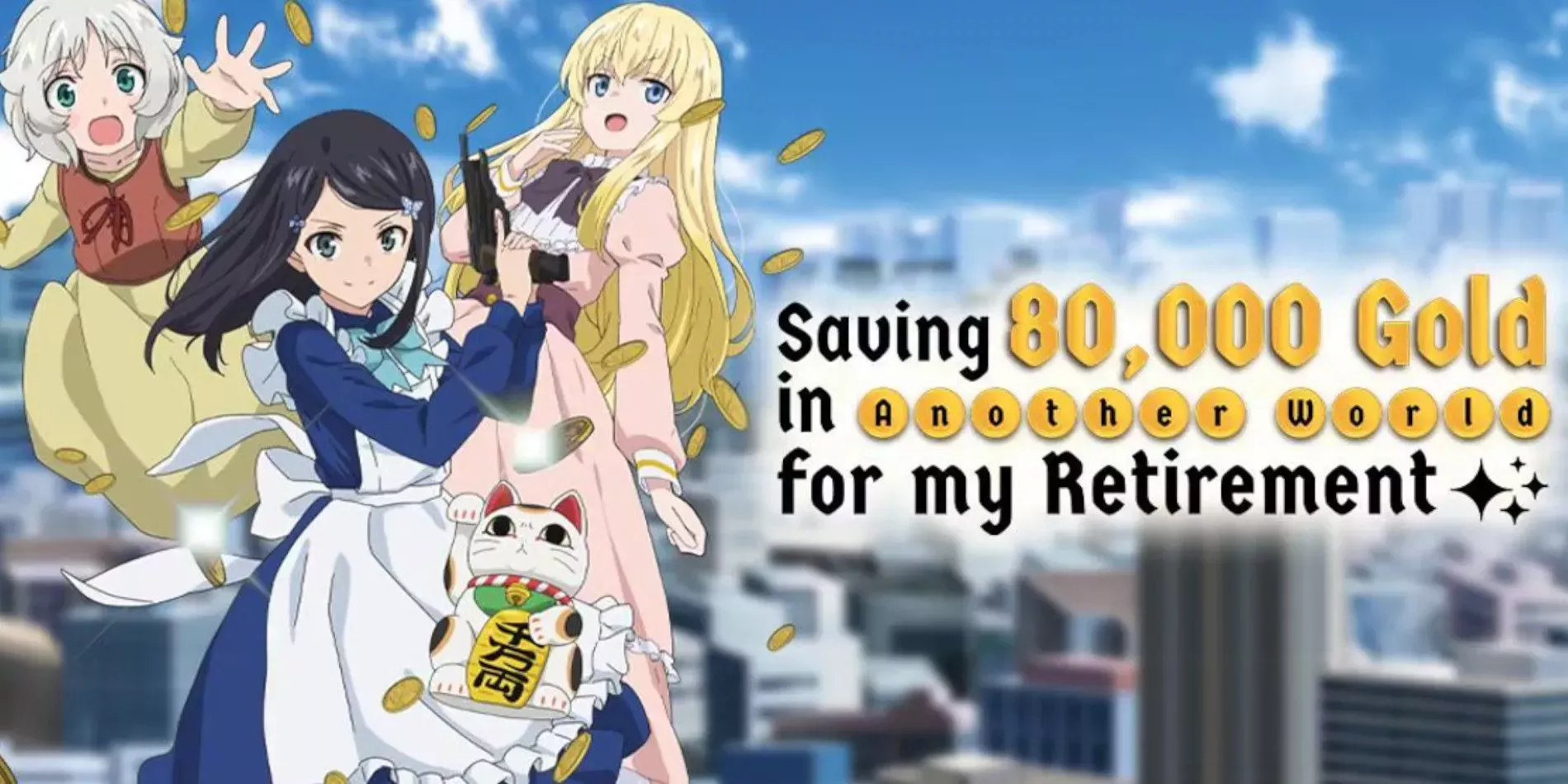 2023's Saving 80,000 Gold in Another World for My Retirement se basa en la serie de novelas ligeras creada por FUNA. Sigue a Mitsuha Yamano, una chica que atraviesa una época terrible. En pocos meses ha perdido a su familia, ha sido rechazada en la universidad de sus sueños y, además, está completamente arruinada. Las cosas empeoran aún más cuando Mitsuha cae por un acantilado, aparentemente hacia su perdición. Sin embargo, Mitsuha no muere, sino que se despierta en un mundo de fantasía. Pronto, Mitsuha se encuentra con un ser cósmico que le informa de que puede saltar entre su antiguo mundo y éste a voluntad. Al darse cuenta de que puede comprar cosas en su antiguo mundo y venderlas más caras en el nuevo, Mitsuha se propone ahorrar 80.000 monedas de oro para poder jubilarse y vivir una vida de lujo.