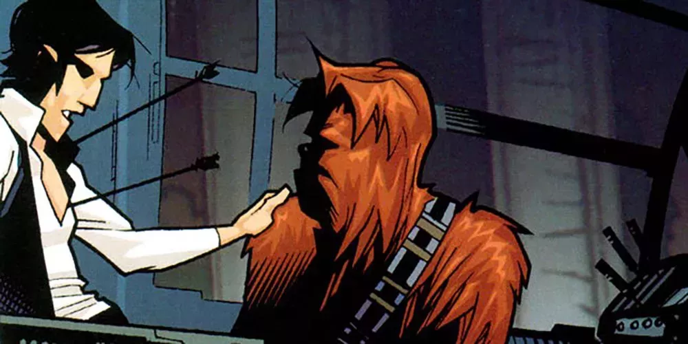 Después de que Han Solo muriera en un encuentro con los nativos americanos, Chewbacca escapó. "Hacia lo desconocido" se trasladó a los años 30, cuando Indiana Jones descubrió la nave caída y los lectores se enteraron de que Chewbacca se había convertido en el legendario Sasquatch.