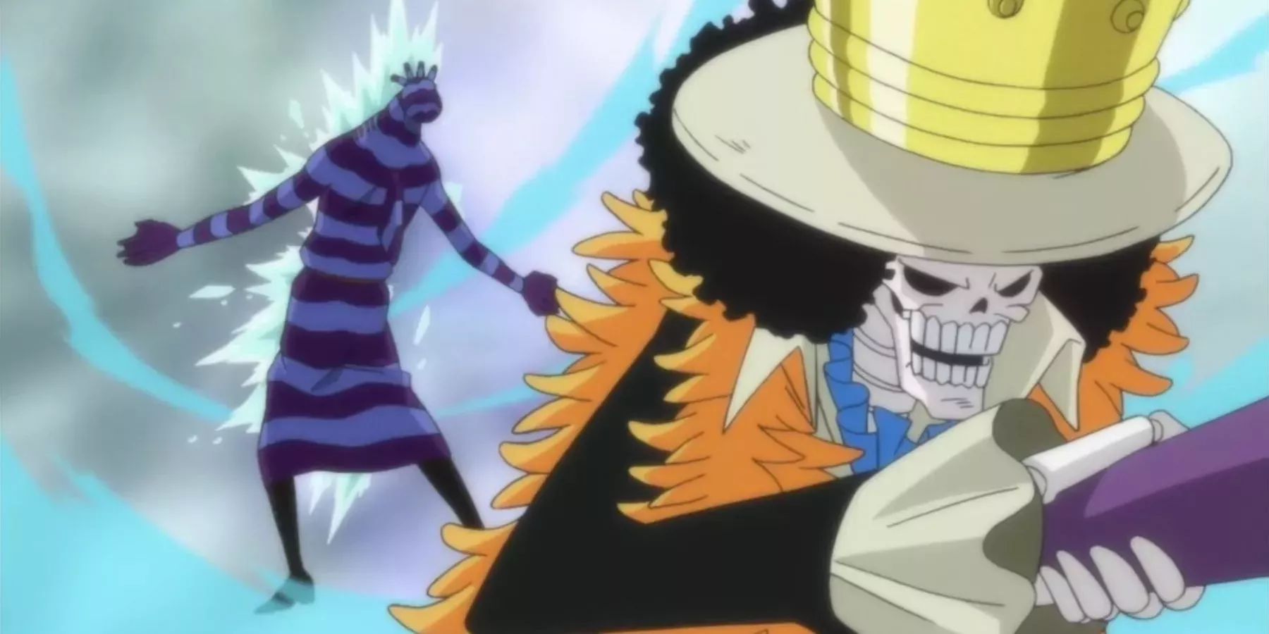 Brook se mueve tan rápido que Zeo ni siquiera se da cuenta de que ha sido cortado con una técnica de espada, Kasuriuta: Fubuki Giri, que convierte su sangre en hielo. Se trata de una exhibición espectacular de velocidad por parte de un luchador que rara vez muestra todas sus habilidades. Brook no tiene muchas batallas a sus espaldas como el resto de los Sombrero de Paja, por lo que este episodio es especialmente notable. Es muy satisfactorio verle luchar en serio.