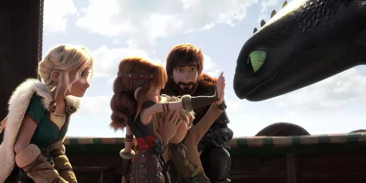 Los momentos finales de la franquicia Cómo entrenar a tu dragón incluyen un conmovedor monólogo de Hipo y un salto en el tiempo. El salto en el tiempo consiste en un Hipo barbudo con Astrid y sus dos adorables hijos en un barco que navega de vuelta hacia el Mundo Oculto. Hipo habla de la existencia de los dragones antes de que aparezca Desdentao.