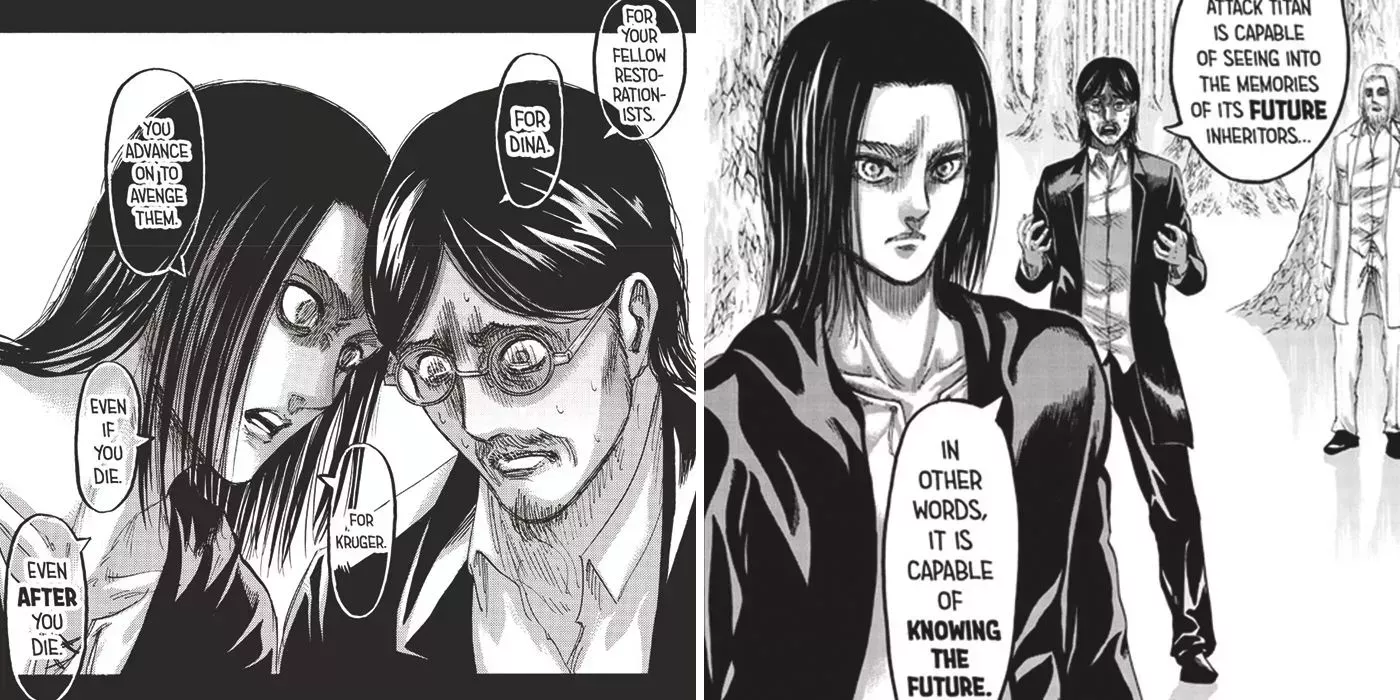 Eren puede ver de repente el futuro al tocar la mano de Historia, cuyo linaje real desbloquea esta habilidad. Obtiene recuerdos de su antiguo yo, de forma similar a lo que hace más tarde con los antiguos herederos del Titán de Ataque. Por desgracia, el futuro que Eren vio arruinó su vida y lo convirtió en la mayor amenaza del mundo.