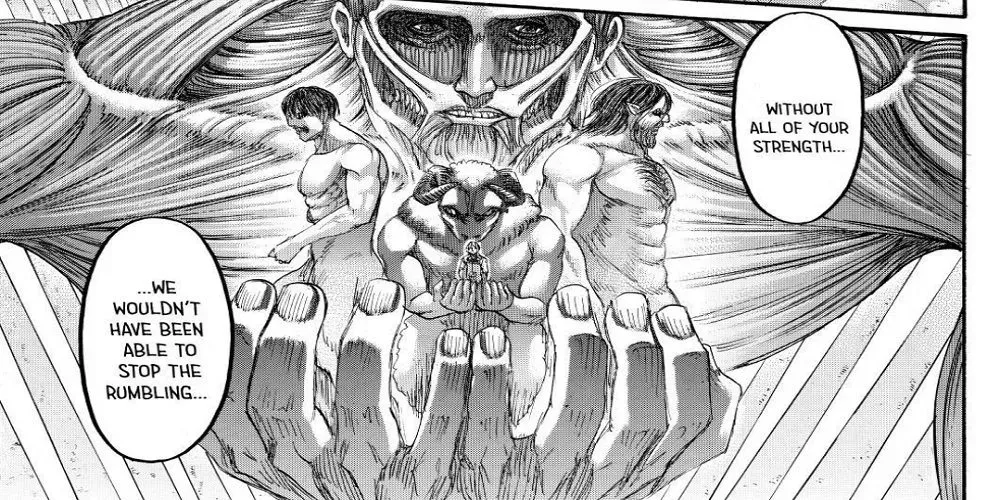 Cientos de Titanes comienzan a revolverse por toda la espalda del Titán del Juicio Final, obligando a los héroes a retroceder y reagruparse. Algunos fans sostienen que este poder fue empleado originalmente por Ymir Fritz y no por Eren, pero a estas alturas es imposible distinguir entre estos dos personajes.
