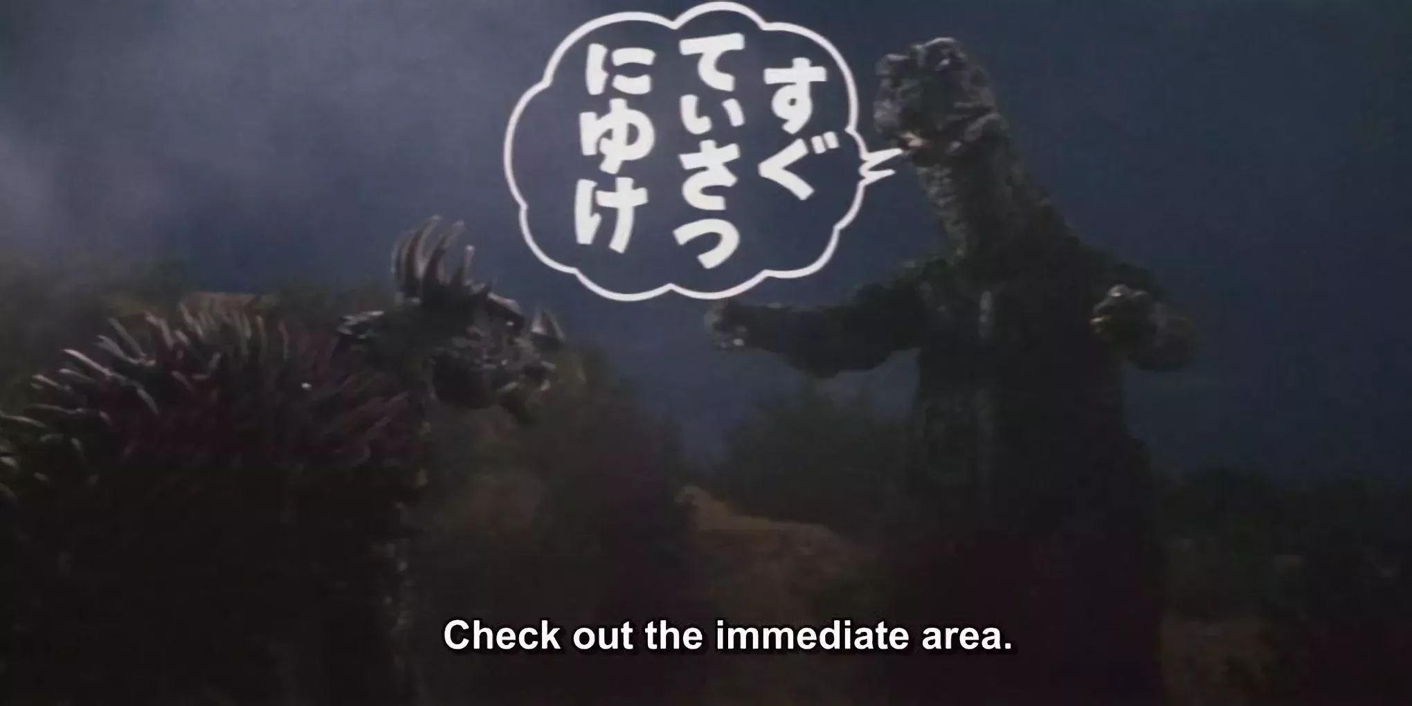 Godzilla contra Gigan, de 1972, fue famosa por introducir al kaiju ciborg alienígena Gigan en la creciente lista de villanos de Godzilla. En la película, los alienígenas M Space Hunter Nebula preparaban "cintas de acción" especiales para transmitir órdenes a Gigan y King Ghidorah. Cuando Godzilla se entera de la frecuencia de dichas cintas de acción, ordena a Anguirus que compruebe el origen de la perturbación. En lugar de los gruñidos y asentimientos habituales, el doblaje inglés es famoso por hacer que Godzilla hable con una voz grava, sin duda un efecto secundario de toda esa respiración atómica. La voz, en particular, saca al público de la escena antes de que pueda contemplar las palabras que salen de la boca de Godzilla.