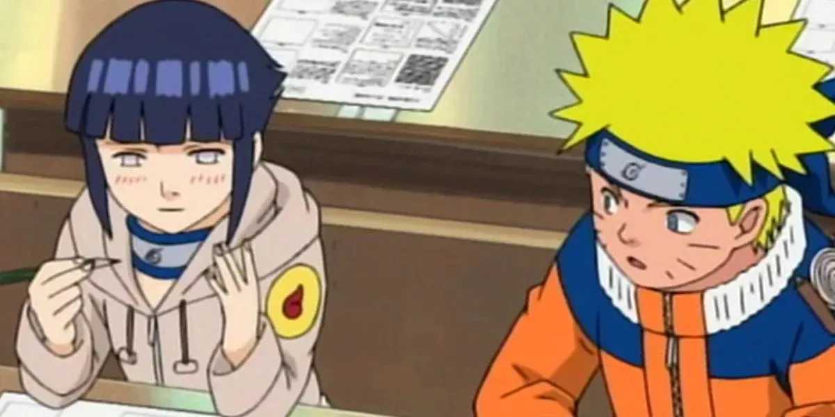 Hinata intenta sutilmente mostrar a Naruto sus respuestas escritas, pero Naruto declina la oferta, no queriendo meterla en problemas. Es una señal temprana del cariño que Hinata siente por Naruto y del papel fundamental que desempeñará ayudándole en el futuro.