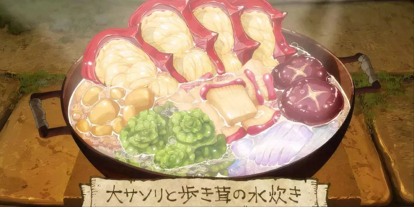 El primer plato que Senshi prepara para Laios, Marcille y Chilchuck. La enorme olla caliente de escorpión y setas andantes es la imaginativa versión de la enana de un clásico de la comida casera que mezcla ingredientes aparentemente sospechosos para crear un plato realmente excepcional. Elaborada con partes de monstruos disponibles en la primera planta de la mazmorra, la olla caliente utiliza carne de escorpión como base proteínica y la combina con carne y patas de seta andante, algas, fideos de baba seca y tallos de plantas.