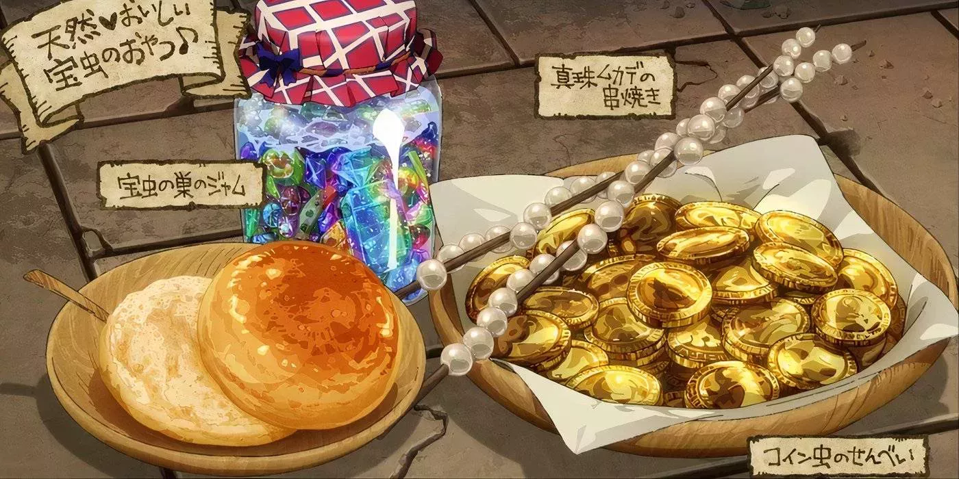 Los insectos del tesoro, uno de los platos más poco ortodoxos visual y conceptualmente que crea Senshi, pueden no parecer especialmente apetitosos, pero, según la fiesta, esta selección de aperitivos ofrece una variedad de deliciosos sabores para satisfacer cualquier antojo. Elaborados a partir de un insólito monstruo que se disfraza de objetos de valor y se aprovecha de los aventureros crédulos, los aperitivos de insectos del tesoro varían en propiedades culinarias y presentación, asemejándose a riquezas que van desde monedas a collares de perlas.