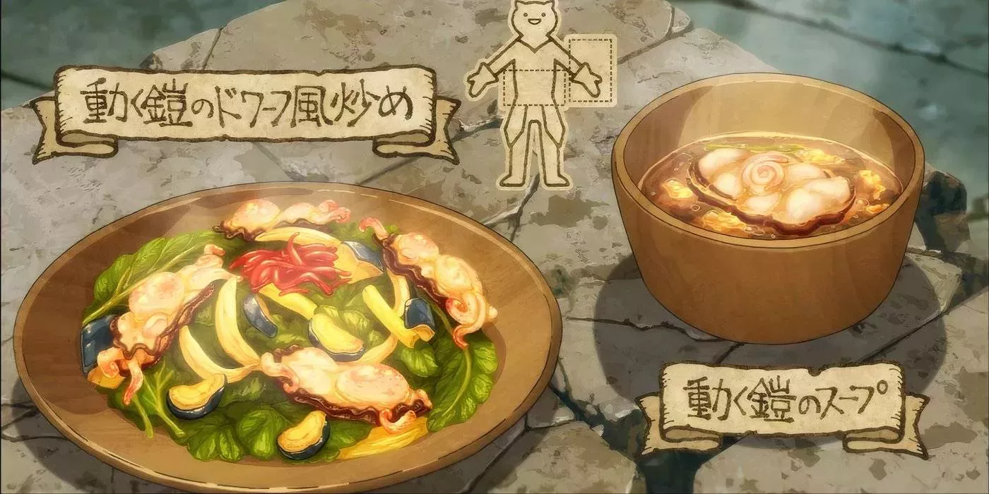 Senshi prueba varios métodos para cocinar este monstruo poco ortodoxo, entre ellos el poco estelar método de cocción al vapor y una técnica un tanto genérica de asado a la parrilla. Sin embargo, el plato que parece resaltar mejor el sabor del molusco es el salteado al estilo enano acompañado de una sopa cremosa y bien condimentada. Esta cena de dos platos, un plato contundente con un gran equilibrio de sabores y texturas, realza el sabor a setas y la textura masticable y jugosa de la armadura viviente.