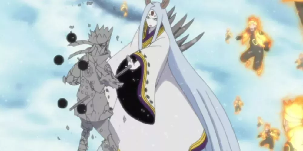 Zetsu Negro resucita a Kaguya tras apuñalar a Madara, presentando así una amenaza aún mayor a la que debe enfrentarse el Equipo Siete. Sasuke percibe inmediatamente que las reservas de chakra de Madara palidecen en comparación con las de Kaguya. Además, Kaguya puede cambiar instantáneamente la dimensión en la que se encuentra, y también puede abrir portales a otras dimensiones, obligando al Equipo Siete a estar constantemente alerta.