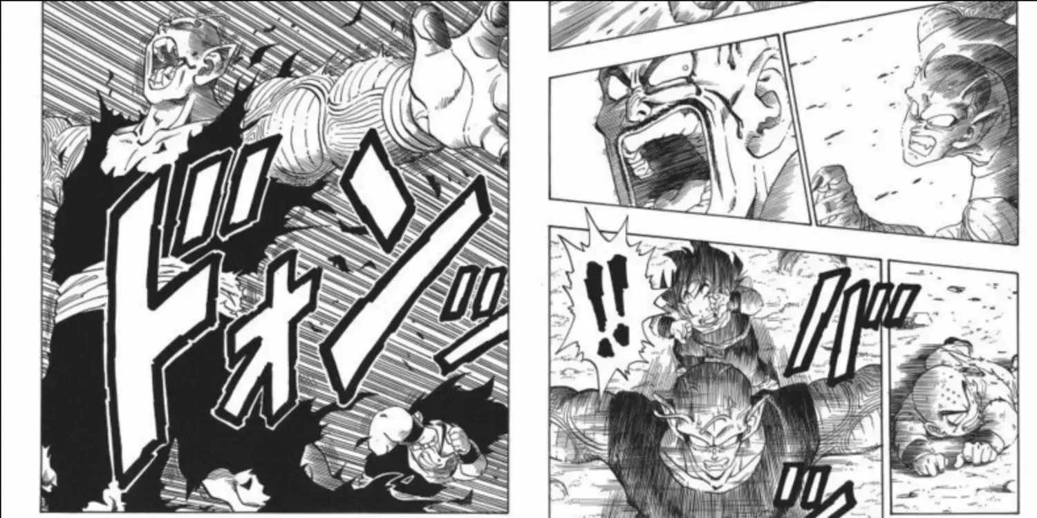 La preparación es sencillamente increÃble, ya que Goku se lanza por los aires con un Kamehameha con una sola mano, una nueva estrategia que no se parece a nada que haya hecho antes. El golpe final de Goku revela que es mucho más fuerte que el Rey Piccolo, y el resultado final es uno de los paneles manga más atrevidos de Dragon Ball. El uso del espacio en blanco mientras Goku destroza al Rey Piccolo, asà como los efectos de sonido, hacen que este panel sea memorable.