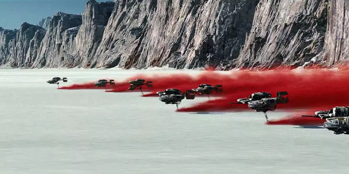 En Los últimos Jedi, las fuerzas de la Resistencia huyen a Crait, con la Primera Orden pisándoles los talones. Tras una persecución prolongada, los combatientes de la Resistencia están exhaustos y se enfrentan a un ejército de la Primera Orden más fuerte y mejor armado, que incluye caminantes, AT-AT y cazas TIE. Sin embargo, gracias al dominio de la Fuerza de Luke Skywalker y a la ayuda de última hora de Rey y Chewbacca, la Resistencia consigue detener a la Primera Orden antes de huir.