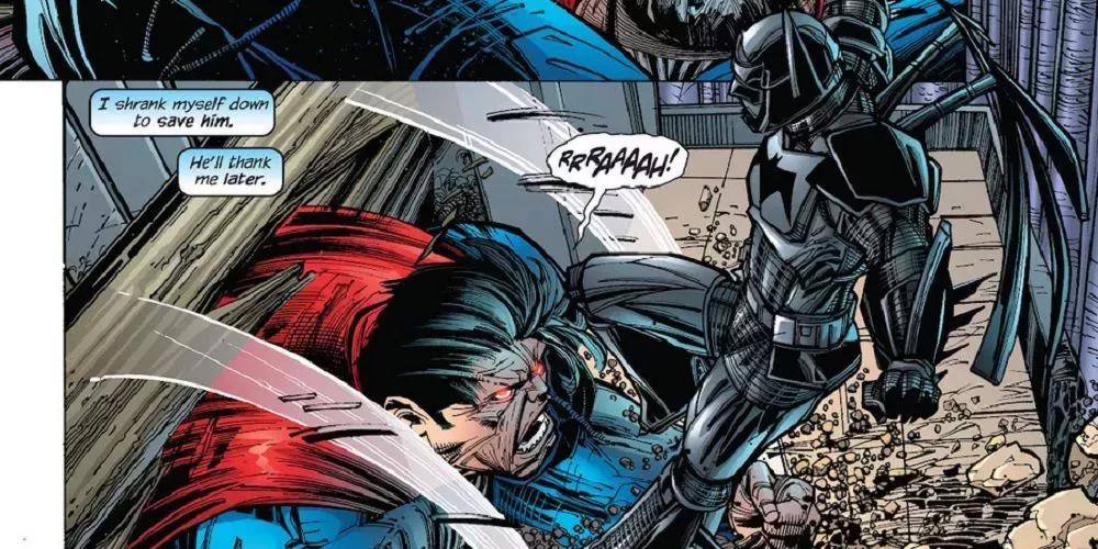 Una batalla con el Bromista obliga a Superman a entrar en el nanoverso, dejando a Batman para que lo persiga. Por supuesto, Batman tenía un plan incluso para esto, y entra en el nanoverso con un vehículo especial y una armadura para sobrevivir allí.
