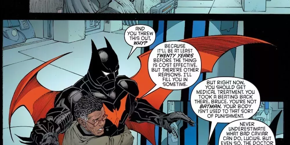 Cerca de la mitad de los Nuevos 52, Batman tuvo que enfrentarse a un nuevo y mejorado Clayface sin su traje de Batman. Cuando perdió, Clayface los arrojó a él y a Lucius Fox en un compactador que contenía WayneTech experimental que no había superado la fase de pruebas. Lo único que salvó tanto a Wayne como a Lucius fue una armadura experimental que se parecía sospechosamente al traje de Batman Beyond.