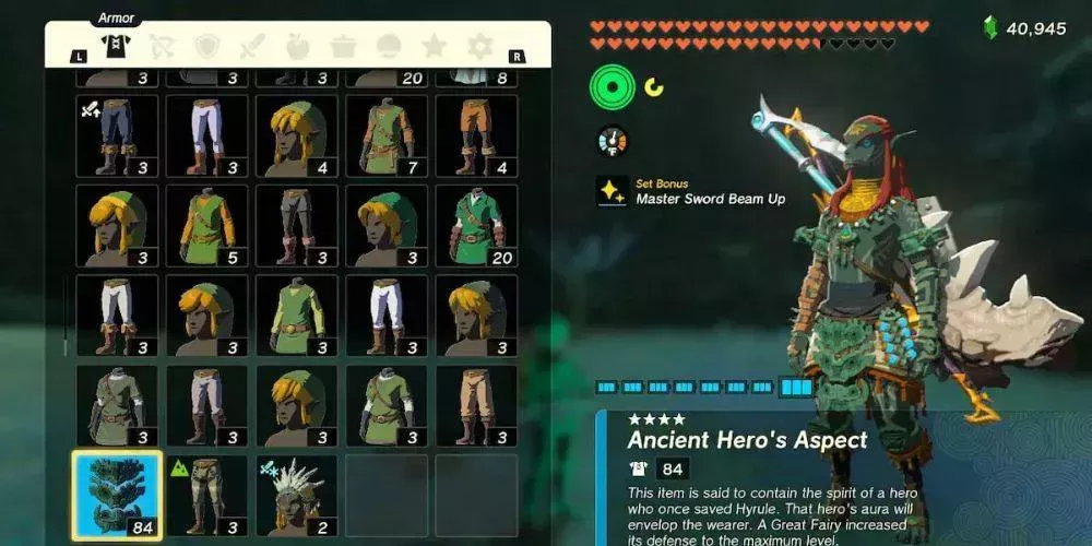 Aunque la armadura Ancient Hero's Aspect no es técnicamente una armadura, es un traje de cuerpo entero con la misma función que una armadura. En concreto, uno de los principales propósitos del Ancient Hero's Aspect es aumentar la defensa de Link, y lo hace de forma significativa. La armadura tiene un aspecto Zonaite épico y una defensa base de 21, que puede aumentar hasta 84 si se potencia en las Fuentes de las Grandes Hadas.