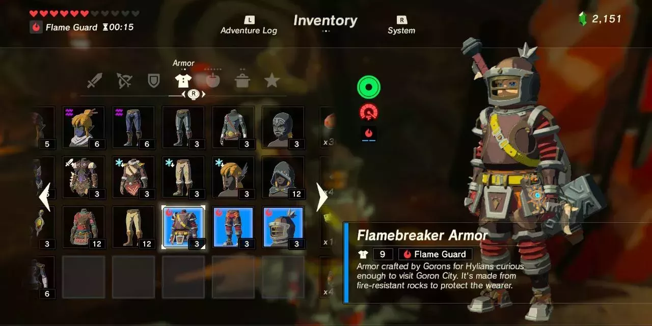 19 Protéjase de los peligros abrasadores con el juego de rompefuegosVencer el calor en Hyrule se convierte en algo fácil con la armadura rompeflamas