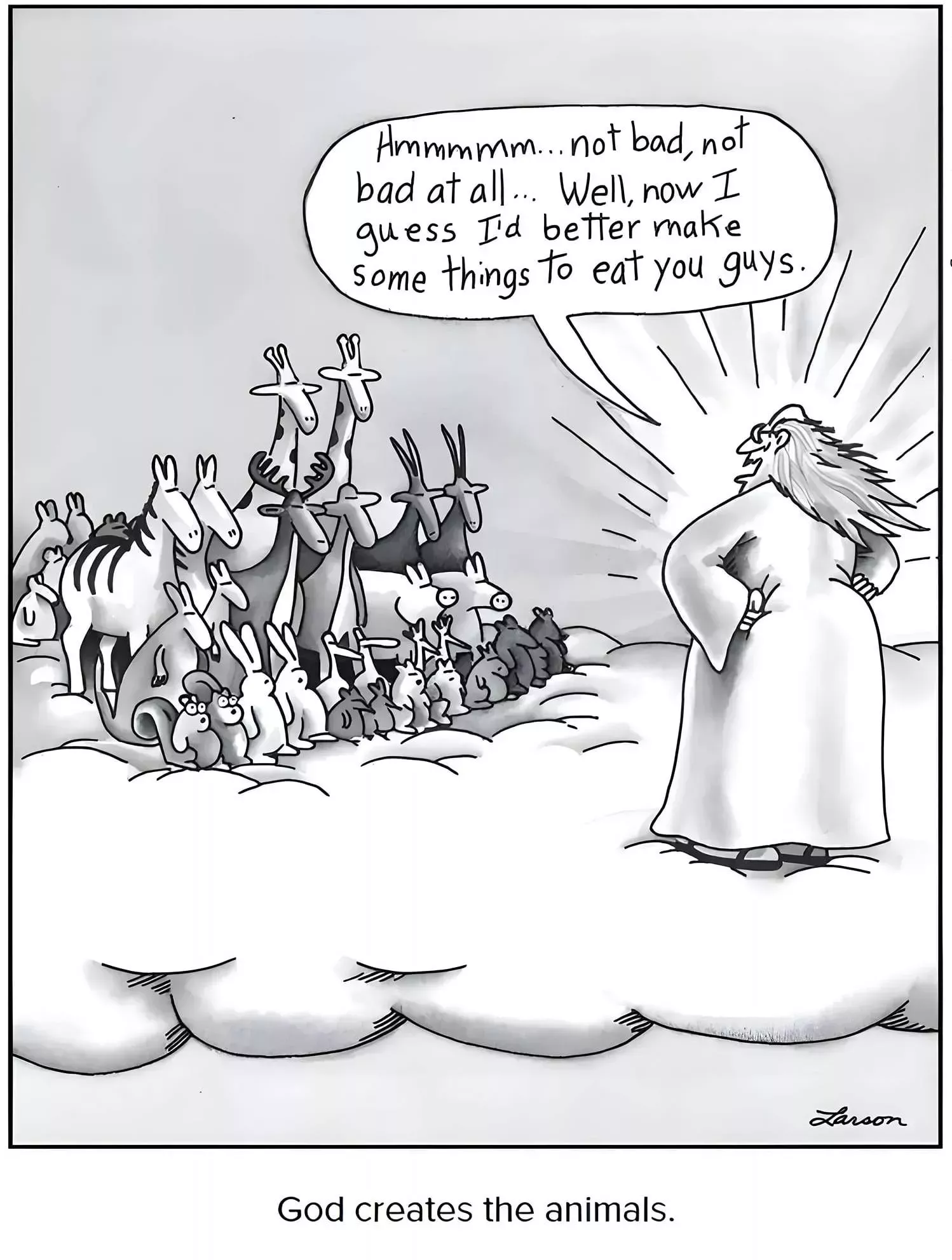 Desde animales de granja hasta políticos, Larson no dudaba en bromear con cualquier cosa en sus tiras cómicas. Ningún tema estaba fuera de sus límites. El humor grosero y la franqueza de estas historietas las convirtieron en un éxito inmediato entre los aficionados durante décadas. The Far Side ha inspirado a innumerables creadores de cómics.