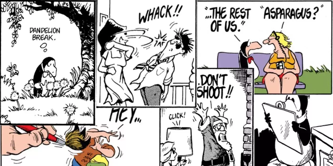 The Far Side debutó en 1980 y enseguida llamó la atención de los lectores por su nuevo enfoque del cómic. De carácter político, esta excéntrica serie de cómics presentaba historietas de un solo panel que rara vez tenían personajes recurrentes. Su creador, Gary Larson, creó algunos de los momentos más oscuros del cómic, con escenas extravagantes que asombraron a los aficionados.