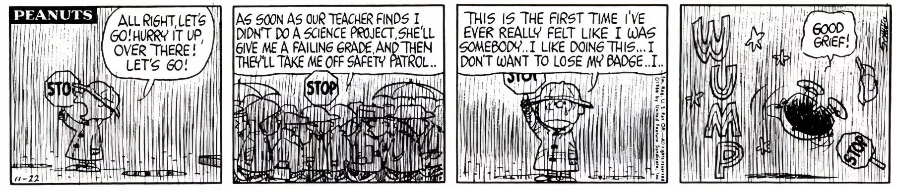 Por desgracia, Charlie Brown nunca puede ganar. Como estaba demasiado distraído para mirar a ambos lados, un coche derrapó hacia él bajo la lluvia y atropelló al pobre chico. Aunque sólo sufrió un golpe y salió completamente ileso, fue el final de su carrera como miembro de la Patrulla de Seguridad, y pronto se dio cuenta de que la Niña Pelirroja ni siquiera se había dado cuenta de sus esfuerzos, o de su heroísmo.