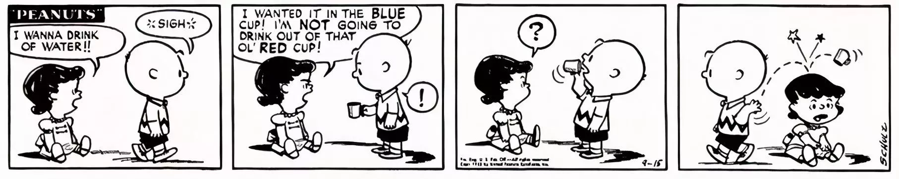 6Normalmente, los cómics de Peanuts presentan a Charlie Brown como el blanco de todas las bromas. Fracasa, minimiza sus propios logros o no consigue dar una patada a un balón de fútbol o volar una cometa. Sin embargo, en la tira de principios del 15 de septiembre de 1952 consiguió una rara victoria sobre Lucy. Cuando ella le exigió que le trajera un vaso de un color específico, Charlie Brown se bebió el agua y le tiró el vaso.