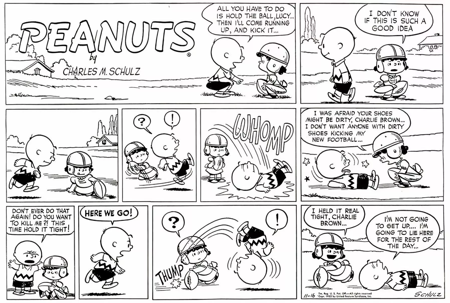 Al principio, Lucy apartó el balón por preocupación, y en el segundo intento lo sujetó con demasiada firmeza en el suelo. Su lucha inicial recontextualiza sus posteriores problemas con el balón y muestra hasta qué punto Charlie Brown confiaba inicialmente en Lucy. Es una de las mejores apariciones de Charlie Brown.