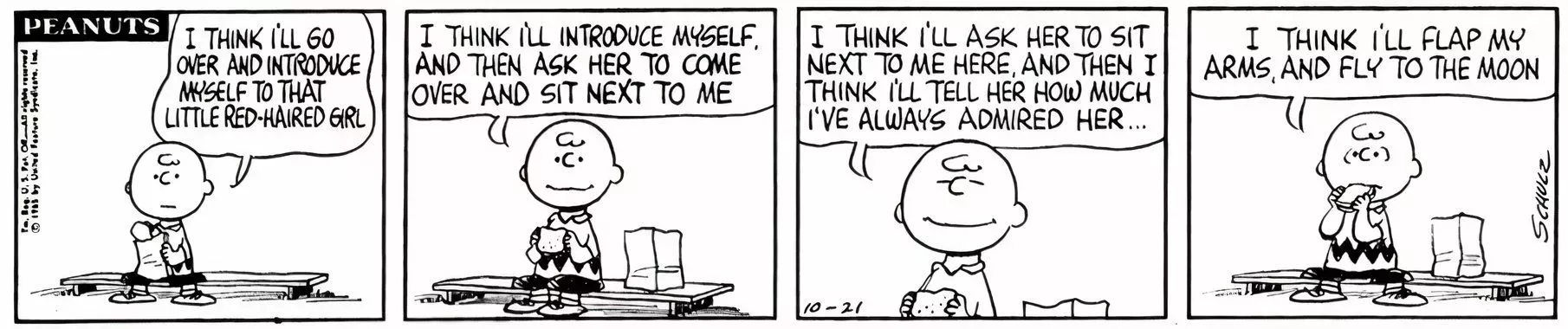 Aunque Charlie Brown piensa en presentarse y conversar con ella, se niega a seguir adelante. La idea de hablar con ella le hace pensar en volar después a la luna. Esto demuestra hasta qué punto el personaje se sabotea a sí mismo. Incluso sin jugar con otro personaje, sigue siendo una figura fascinante e hilarante que siempre se falla a sí mismo.