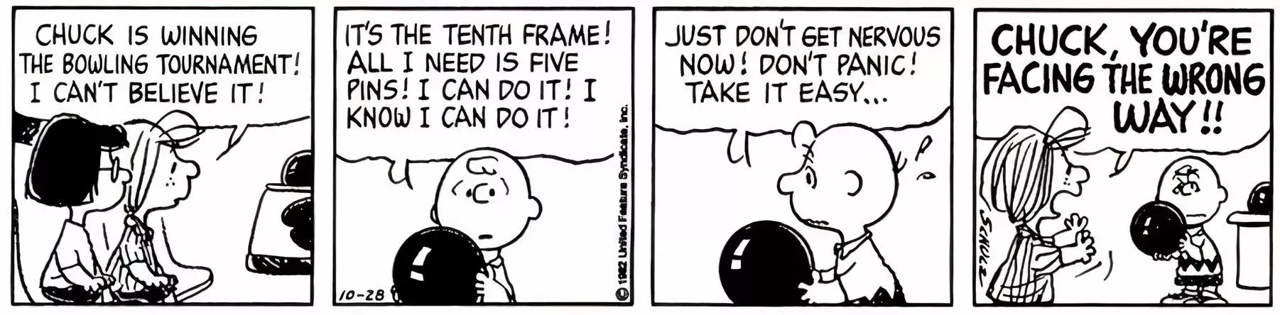 Jugar a los bolos no es fácil, pero algunos errores pueden ser francamente desconcertantes. Con Charlie Brown preparándose para ganar un torneo de bolos, sólo necesitaba cinco bolos para ganar la partida. Por desgracia, no tenía ni idea de dónde lanzar la bola. En uno de sus mejores momentos, demostró que puede tropezar incluso ante un éxito casi garantizado. Al fin y al cabo, se había equivocado de dirección con la bola de bolos.
