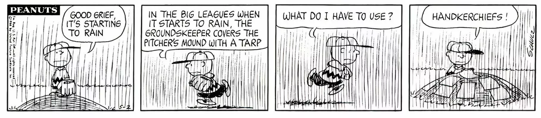 La tira del 2 de mayo de 1966 llevó ese concepto al extremo. Charlie Brown está tan dedicado al deporte y no recibe ayuda de los adultos y niños que le rodean que se queda cubriendo el montículo del lanzador con pañuelos en lugar de con una lona. Aunque inútil, es un esfuerzo adorable que demuestra lo mucho que le importa. Es una muestra dulce y adorable de su carácter.