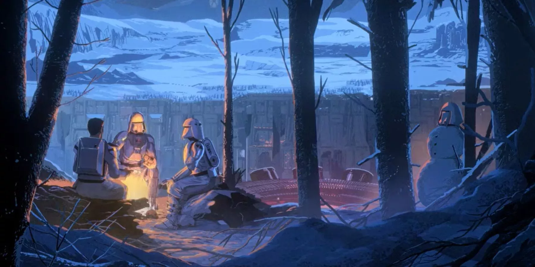 En "Snowy Starkiller Base | Star Wars Lofi", los soldados de asalto asan malvaviscos en una hoguera en los bosques de la Base Starkiller. Un muñeco de nieve con aspecto de soldado de asalto contribuye al encanto festivo del vídeo, que desmiente el siniestro propósito de la Base Starkiller.
