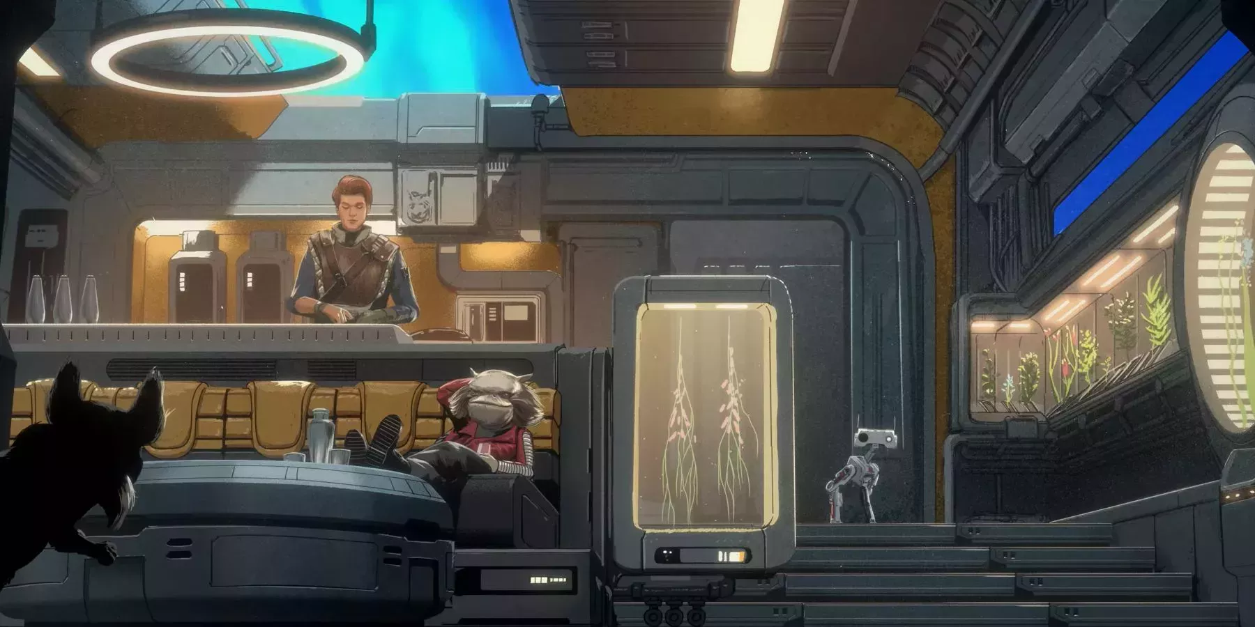 "Cal Kestis en la Stinger Mantis | Star Wars Lofi" muestra a Cal Kestis, Greez Dritus y BD-1 de Star Wars Jedi: Fallen Order y Star Wars Jedi: Survivor relajándose mientras el Stinger Mantis viaja por el hiperespacio. La música es jazzy con algunos ritmos de hip-hop, dando una sensación de aventura incluso cuando los personajes están en reposo.