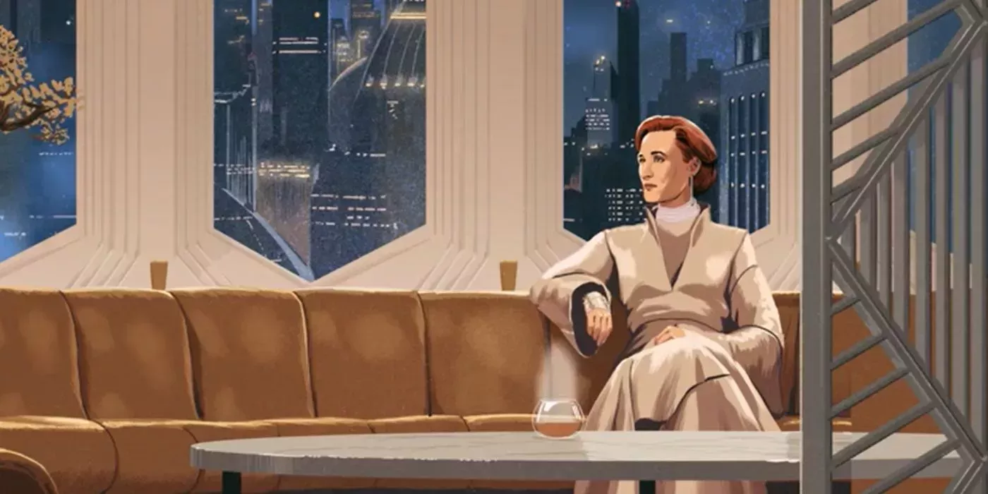 En "Un momento tranquilo con Mon Mothma | Star Wars Lofi", Mon Mothma se sienta en un sofá junto a su ventana. Las luces de varios vehículos pasan por su ventana a pesar de la lluvia que cae sobre Coruscant. Mientras pasa una figura en silueta, el vídeo enfatiza la solitaria posición de Mon en la Rebelión.