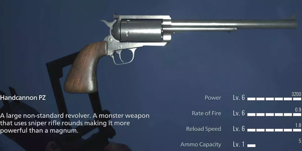 El cañón de mano PZ solo está disponible después de superar la campaña de Resident Evil Village en dificultad Difícil o superior. No tiene piezas mejorables, pero en realidad no las necesita. Aunque se trata de un revólver, utiliza munición de rifle de francotirador, lo que básicamente le confiere la potencia de un rifle de francotirador en un diminuto dispositivo portátil.