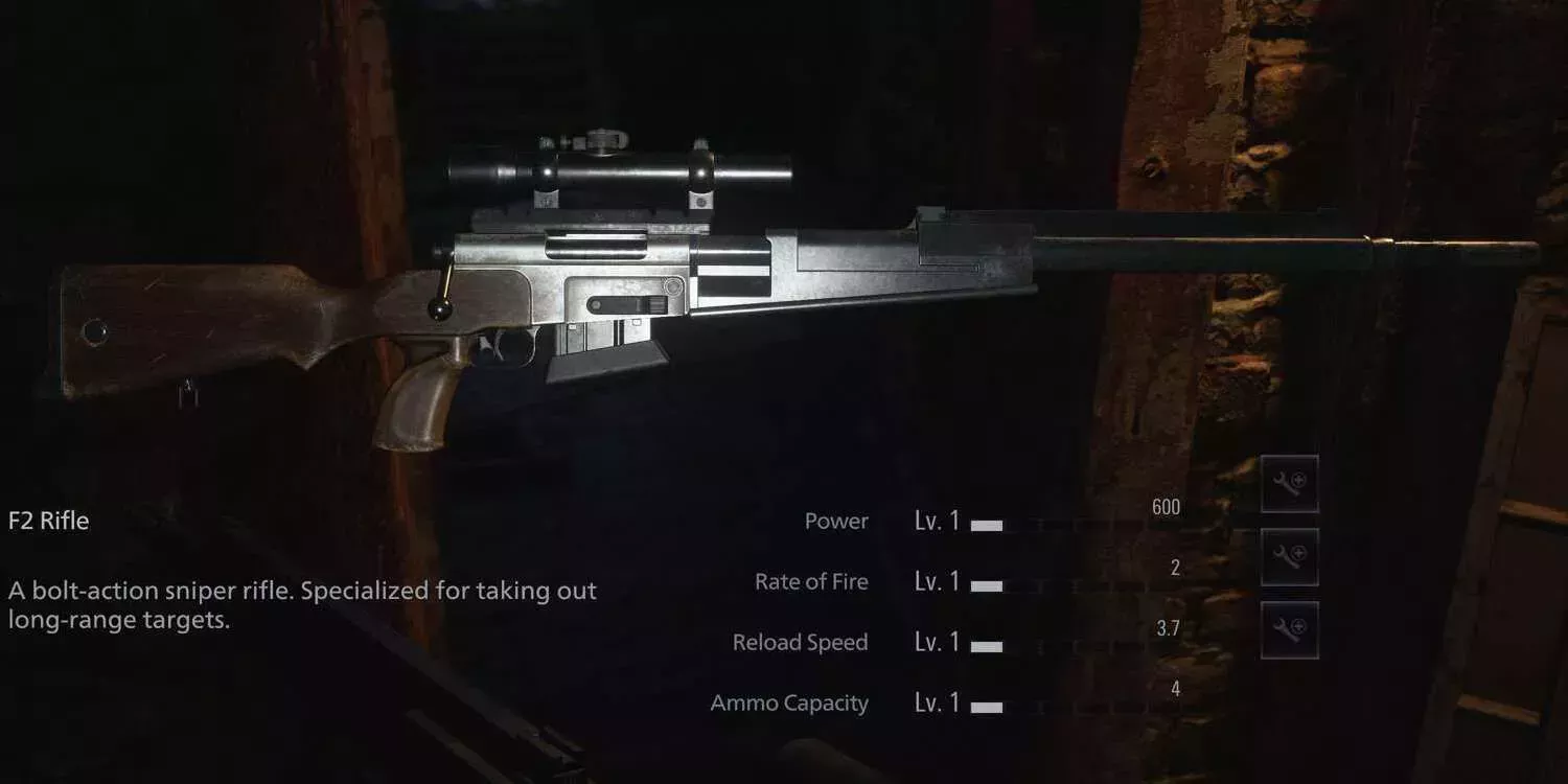 Una vez que el jugador ha obtenido las tres mejoras para esta arma, que incluyen una carrillera, un cargador de gran capacidad y una mira de gran aumento, es capaz de abatir a la mayoría de los enemigos de un solo disparo. El inconveniente del rifle de francotirador es que no resulta muy práctico en espacios reducidos. Gran parte de Resident Evil Village transcurre en zonas en las que el francotirador no es una opción, pero en las zonas en las que se puede utilizar, el rifle F2 es increíblemente potente.