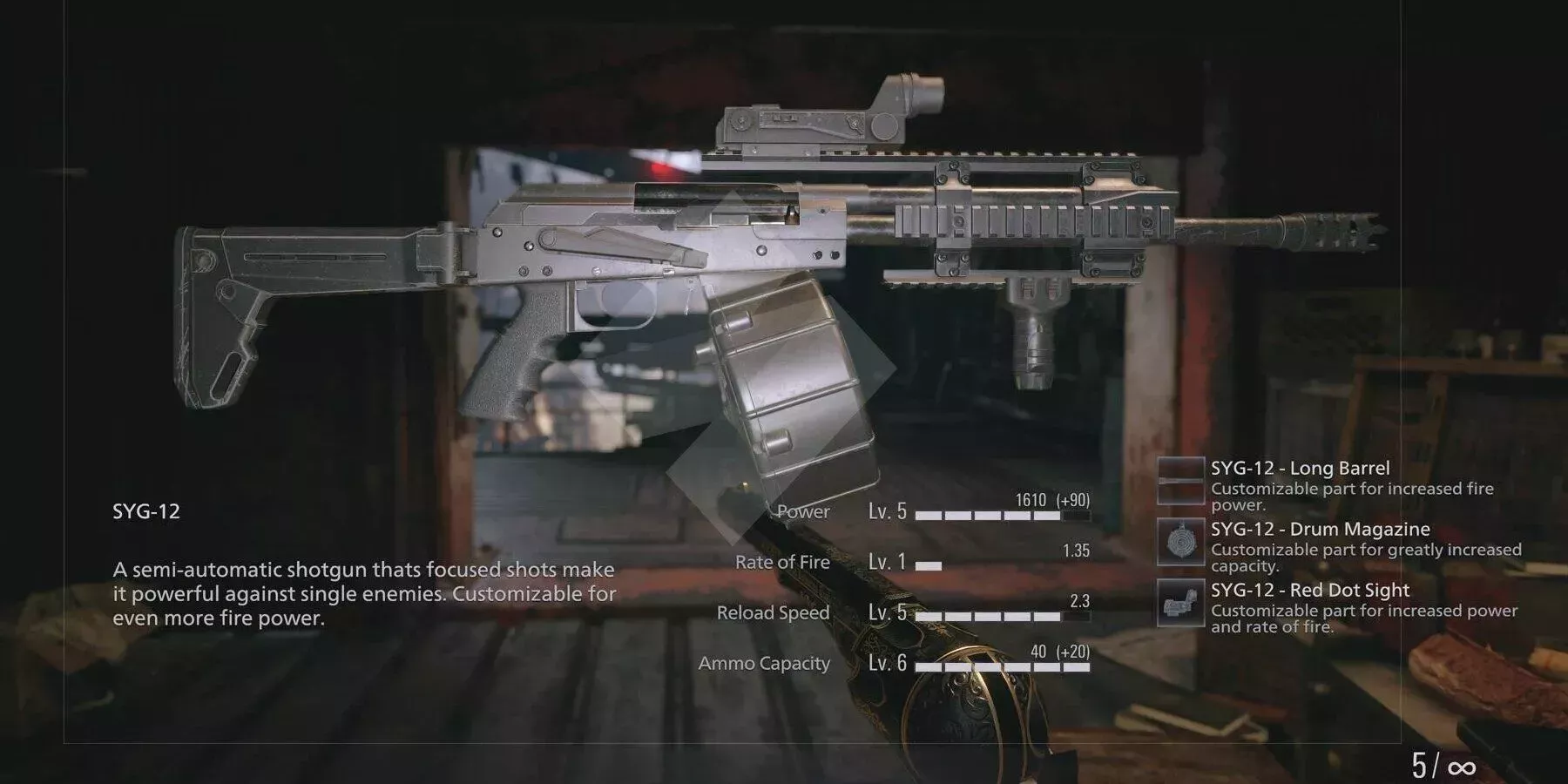 Las otras dos -la de cañón largo y la de cargador de tambor- pueden adquirirse después de la primera vez que el jugador supera el juego. Fácilmente la mejor escopeta que ofrece Village, puede matar enemigos de un solo golpe y hacer retroceder a varios enemigos al mismo tiempo. Aunque el rifle de francotirador sea técnicamente más potente, la SYG-12 es más versátil y letal en el cuerpo a cuerpo.