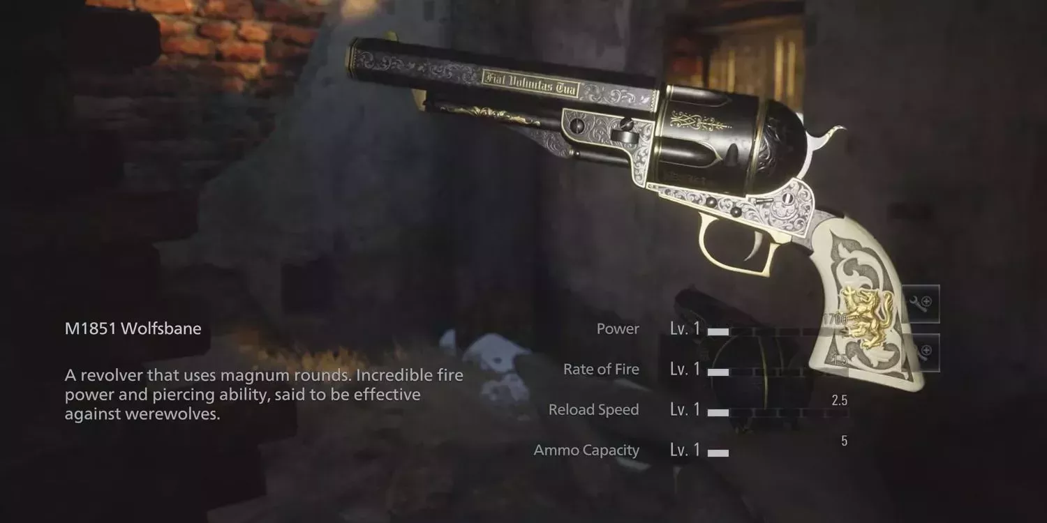 En Resident Evil Village, Ethan encuentra el M1851 Wolfsbane en el laboratorio de Moreau. Tiene dos mejoras disponibles en la fábrica de Heisenberg, y es, sin duda, el arma más poderosa disponible para una primera partida. De hecho, sólo hay un arma en todo el juego que supere la potencia bruta de la M1851 Wolfsbane.