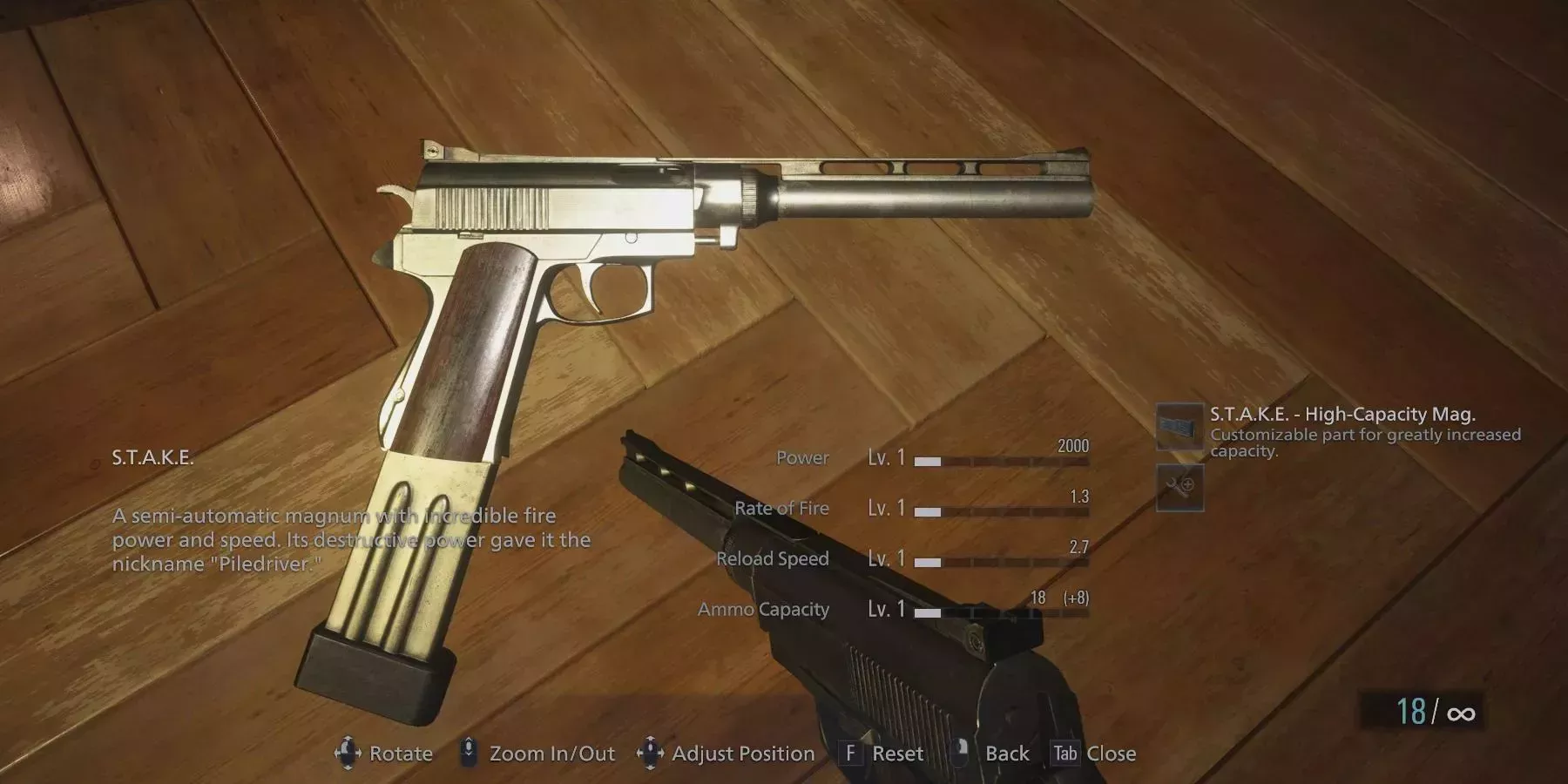La S.T.A.K.E. se puede comprar a Duke después de que el jugador haya derrotado a Resident Evil Village una vez en cualquier dificultad. Tiene dos mejoras, una empuñadura mejorada y un cargador de gran capacidad, que también se pueden comprar en el Emporio de Duke. Esta magnum es sin duda el arma más potente del juego.