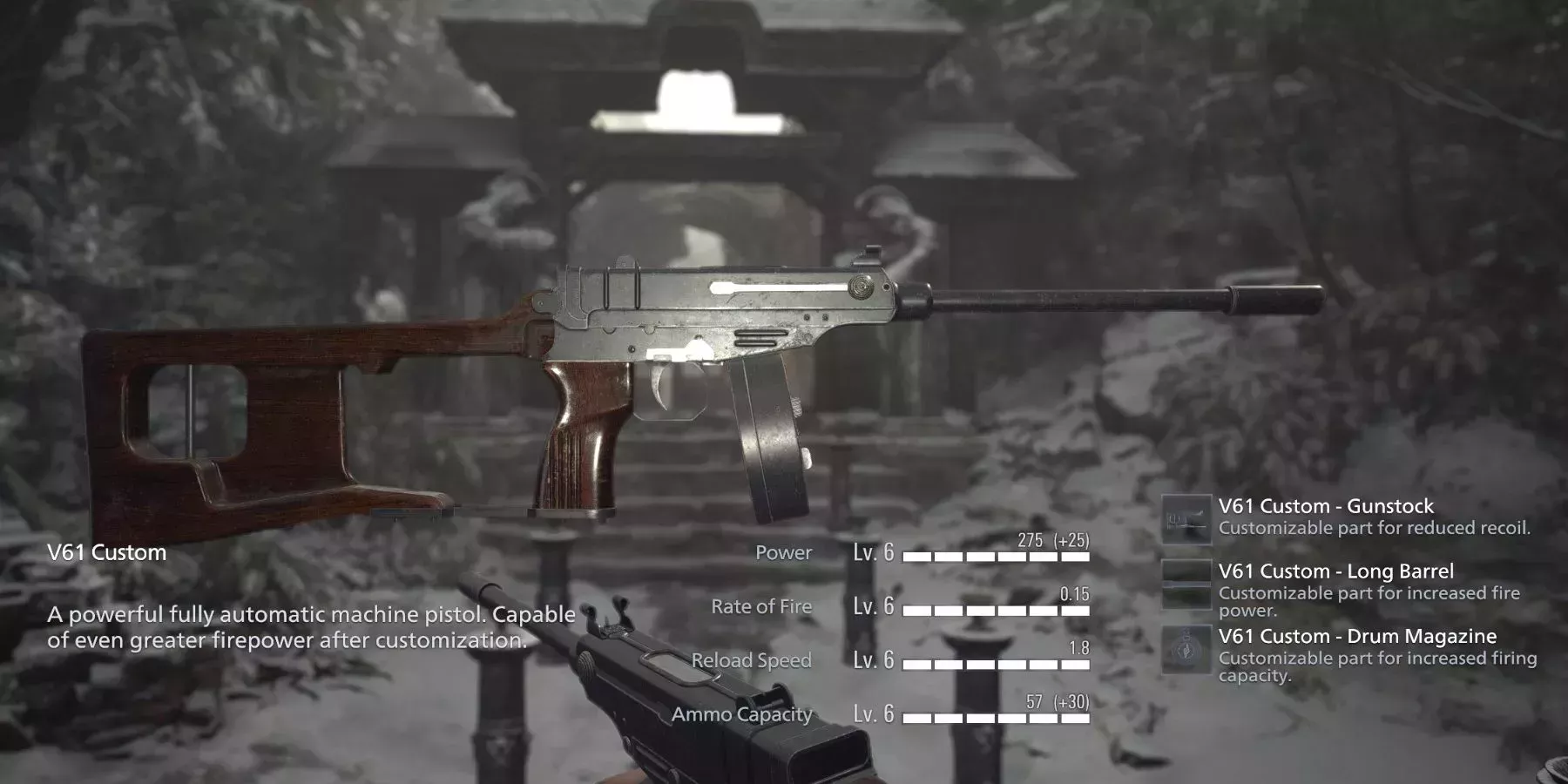 Con las tres mejoras instaladas en la V61 Custom, se convierte en la pistola más potente que ofrece Resident Evil Village. Es cara, pero añadirla al arsenal del jugador merece la pena. Esta pistola supera incluso a la USM-AI de la tienda de contenido extra.