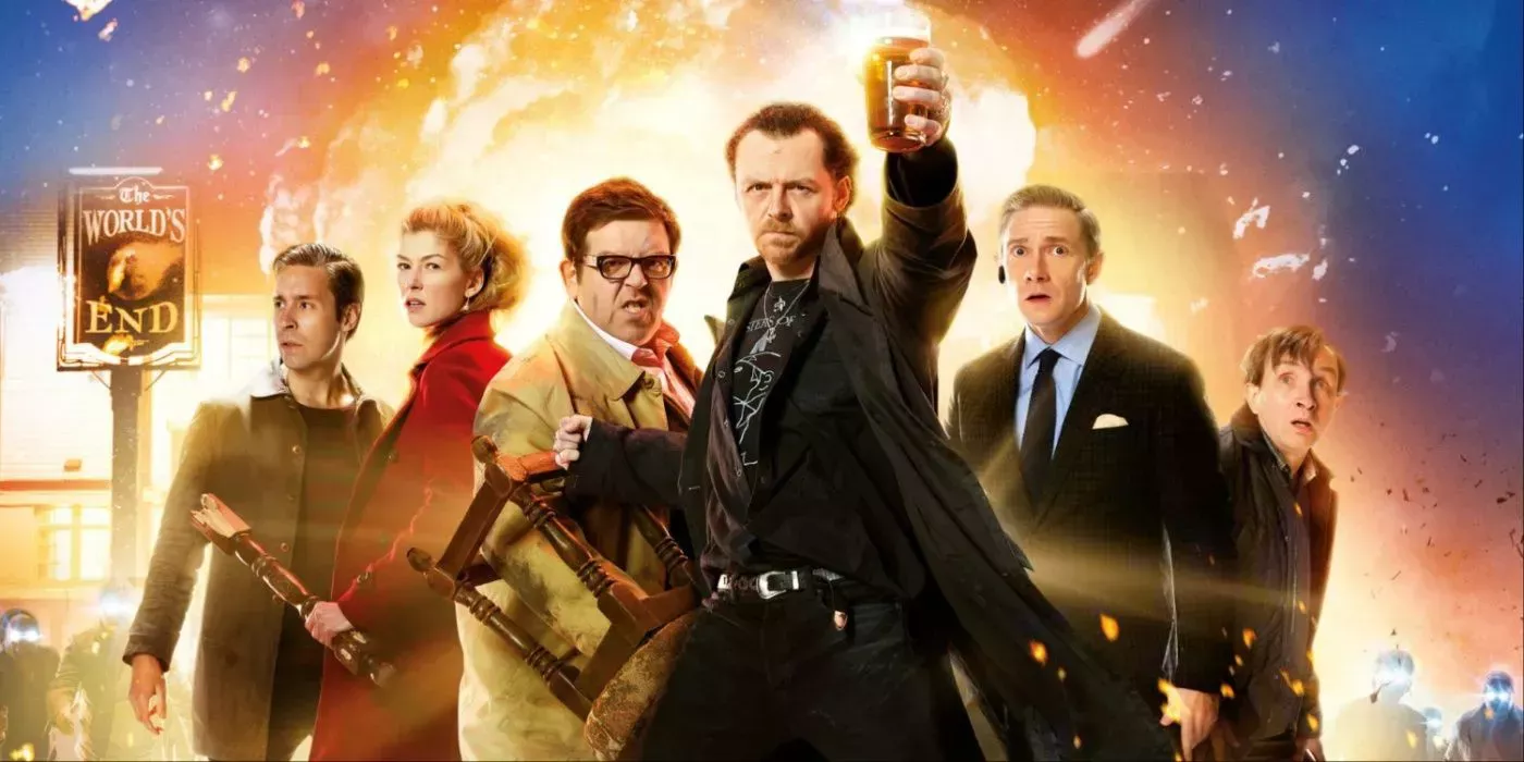 The World's End sigue a un grupo de amigos que regresan a su ciudad natal, pero rápidamente se dan cuenta de que algo va mal. Simon Pegg interpreta a Gary King, el "líder" de su grupo de amigos de la infancia que parece estar atrapado en el pasado. Nick Frost interpreta a Andy, el mejor amigo de Gary, que se enemistó con él tras un accidente de tráfico en el que conducía borracho. El grupo de amigos de Gary también está formado por Martin Freeman, de Sherlock , que interpreta a Oliver, Paddy Considine , de Dead Man's Shoes, como Steven, y Eddie Marsan , de Happy-Go-Lucky, como Peter, con Rosamund Pike , de Gone Girl, como el interés amoroso de Gary y Steven. En The World's End, Gary y sus amigos regresan a su ciudad natal para terminar un recorrido por un pub que no pudieron terminar cuando eran más jóvenes, sólo para darse cuenta de que los habitantes de su ciudad han sido sustituidos por espeluznantes alienígenas con aspecto de robot. El reparto, repleto de estrellas, contribuye a la calidad de la película, pero El fin del mundo, aunque estupenda en sí misma, se queda un poco por detrás de las otras películas de la trilogía de los tres sabores de Cornetto.