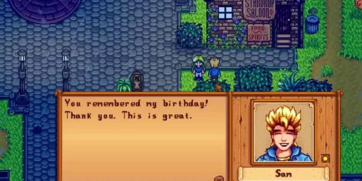 Sam es uno de los personajes más dulces de Stardew Valley. Casi siempre está entusiasmado por ver y hablar con el jugador. Esto hace que cada conversación con él sea agradable. Sam también tiene uno de los romances más fáciles de Stardew Valley debido a este aprecio por la Joja Cola barata que todos los demás odian.