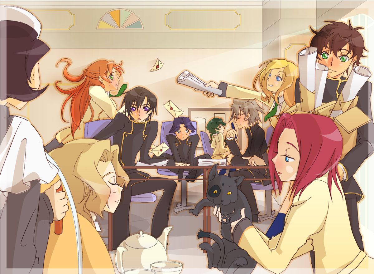 En uno de los episodios más tontos y memorables de Code Geass, Lelouch pasa un día entero persiguiendo a un gato. Mou_Sinou creó un hermoso cuadro en el que Kallen y Shirley se tropiezan con este gato, sin saber lo cerca que estuvo de exponer la identidad secreta de Lelouch.